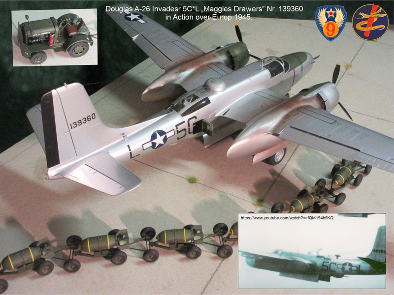 The Invader is in colors of the 9 AF, 416BG, 371BW “Maggies Drawers.” On April 10, 1945, the mission was set to destroy the large railway viaduct near the city of Eger (Cheb). This important railway was the connection between the east and the west. The raid was successful, and the railway connection was interrupted. The viaduct was repaired again, taking several years, and is still in use today. I was lucky for the camouflage because I found references on the Internet where there is a long video and a great website on the history of the 416th.