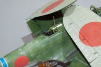 I’ve read that the grey-green paint and Hinomarus would have been properly applied onto a primer base and thus did not show the characteristic flaking seen on most green camouflaged Japanese aircraft. So, my assumption is that the green was applied over the primed grey base coat at a later stage and most probably in less than optimal conditions thus resulting in a significant flaking of the green. I masked the Hinomarus and other markings before applying a coat of Ammo/MiG-2011 “heavy chipping effects” to the base grey-green and then airbrushed Mr. Colour 129 “Nakajima dark green” to give a patchy look. Random areas were then darkened with Tamiya XF-112 JN Green. Water was then applied with a stiff brush and areas of green removed care of the chipping effects fluid. This was then all sealed in with Tamiya X-22 gloss varnish after which a wash of MiG-1209 “Starship Streaking” was applied followed by some random areas of oils and pastels. A final coat of Tamiya flat varnish finished it off.