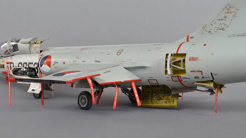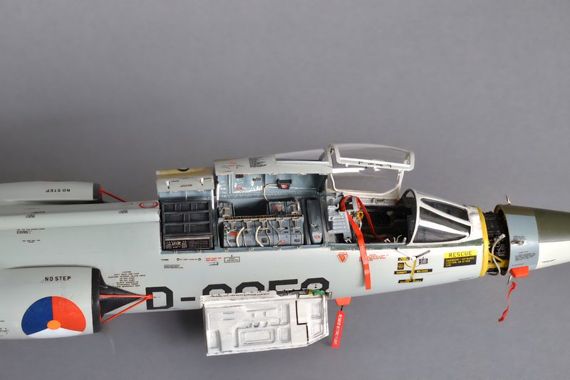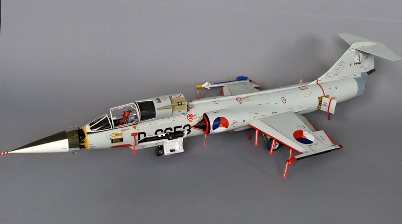 The F-104G was introduced into the Royal Netherlands Air Force in 1962. Most aircraft were built by Fokker, but the 25 Starfighters in the D-6*** series were built by Fiat and provided to the RNLAF from 1965 onward under the Mutual Defense Aid Program. Originally, the Starfighters were camouflaged gray all over. Common wisdom has it that this color was RAL 7001. However, comparing contemporary pictures of the gray and the later 3-tone camouflaged Starfighters makes me believe the original Starfighters were camouflaged in a lighter shade of gray. I chose XtraColours FS16473 (Air Defense Grey) as my color. Decals are by DutchDecal and Daco for the stencils. Additional details are Aires exhaust, electronics bay, cockpit, air brakes, CMK gun bay, hydraulics bay and radar, Master pitot tube and gun barrels, Eduard AIM-9B Sidewinder and a scratch-build parachute housing.