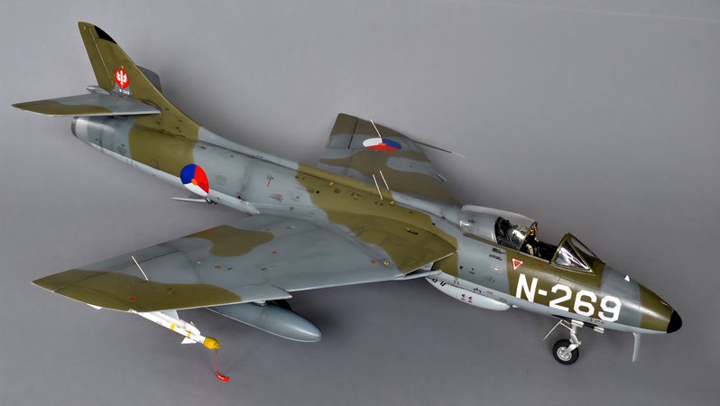 The Royal Netherlands Air Force ordered 93 Hawker Hunter Mk.6 aircraft to replace the Hawker Hunter Mk.4s already in service. All aircraft were built in 1957 thru 1959 by the Fokker company in the Netherlands, equipping 4 squadrons. The Dutch Hunter Mk.6s were modified to carry AIM-9B Sidewinder missiles. The model shows a Hunter assigned to 324 Squadron at Leeuwarden AB in the Netherlands. This squadron disbanded in 1964, to be reconstituted as a Hawk surface-to-air missile squadron in West-Germany: ‘NATO’s finest Hawk squadron’ (as a former CO of this unit I might be slightly biased..).