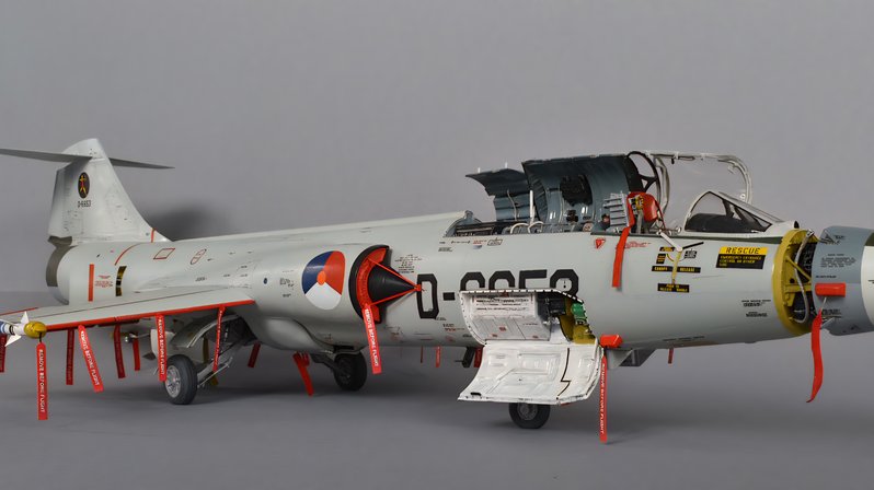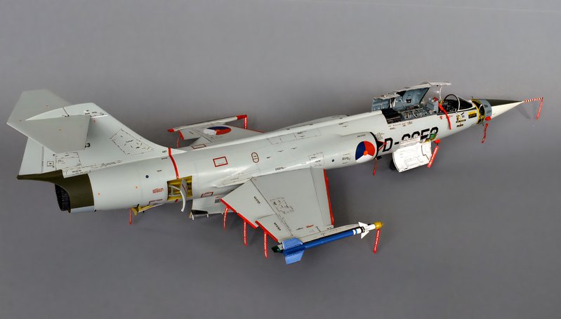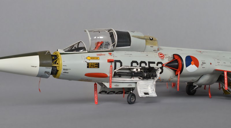 The F-104G was introduced into the Royal Netherlands Air Force in 1962. Most aircraft were built by Fokker, but the 25 Starfighters in the D-6*** series were built by Fiat and provided to the RNLAF from 1965 onward under the Mutual Defense Aid Program. Originally, the Starfighters were camouflaged gray all over. Common wisdom has it that this color was RAL 7001. However, comparing contemporary pictures of the gray and the later 3-tone camouflaged Starfighters makes me believe the original Starfighters were camouflaged in a lighter shade of gray. I chose XtraColours FS16473 (Air Defense Grey) as my color. Decals are by DutchDecal and Daco for the stencils. Additional details are Aires exhaust, electronics bay, cockpit, air brakes, CMK gun bay, hydraulics bay and radar, Master pitot tube and gun barrels, Eduard AIM-9B Sidewinder and a scratch-build parachute housing.