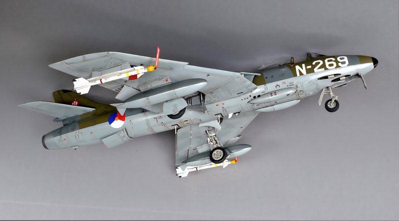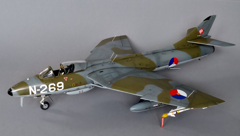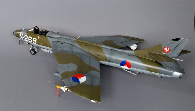 The Royal Netherlands Air Force ordered 93 Hawker Hunter Mk.6 aircraft to replace the Hawker Hunter Mk.4s already in service. All aircraft were built in 1957 thru 1959 by the Fokker company in the Netherlands, equipping 4 squadrons. The Dutch Hunter Mk.6s were modified to carry AIM-9B Sidewinder missiles. The model shows a Hunter assigned to 324 Squadron at Leeuwarden AB in the Netherlands. This squadron disbanded in 1964, to be reconstituted as a Hawk surface-to-air missile squadron in West-Germany: ‘NATO’s finest Hawk squadron’ (as a former CO of this unit I might be slightly biased..).